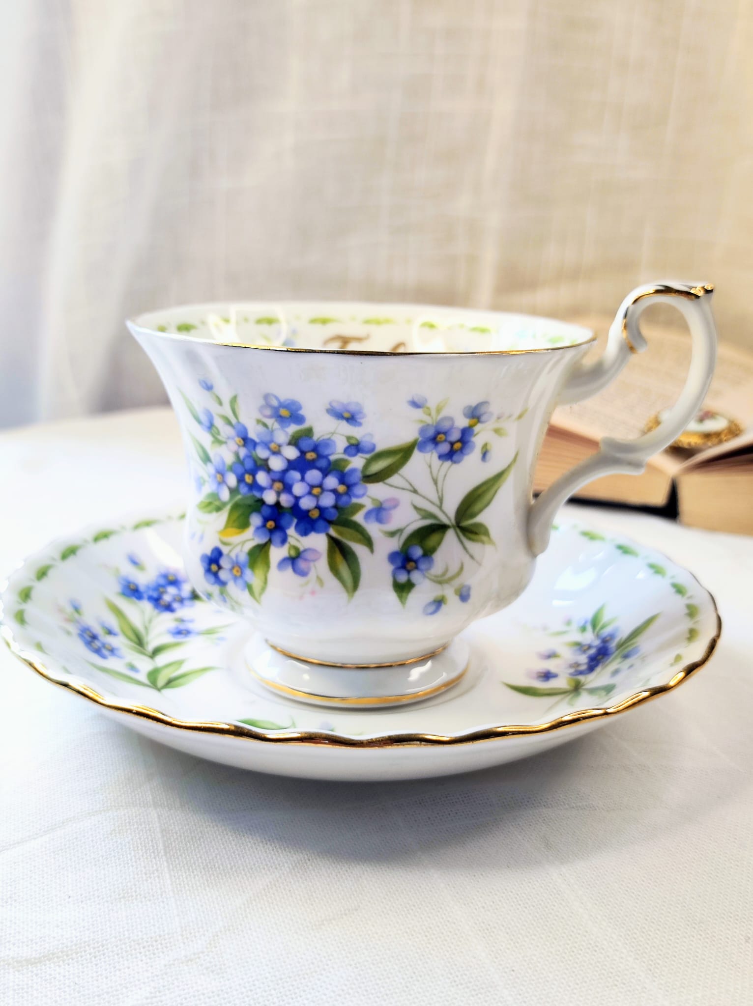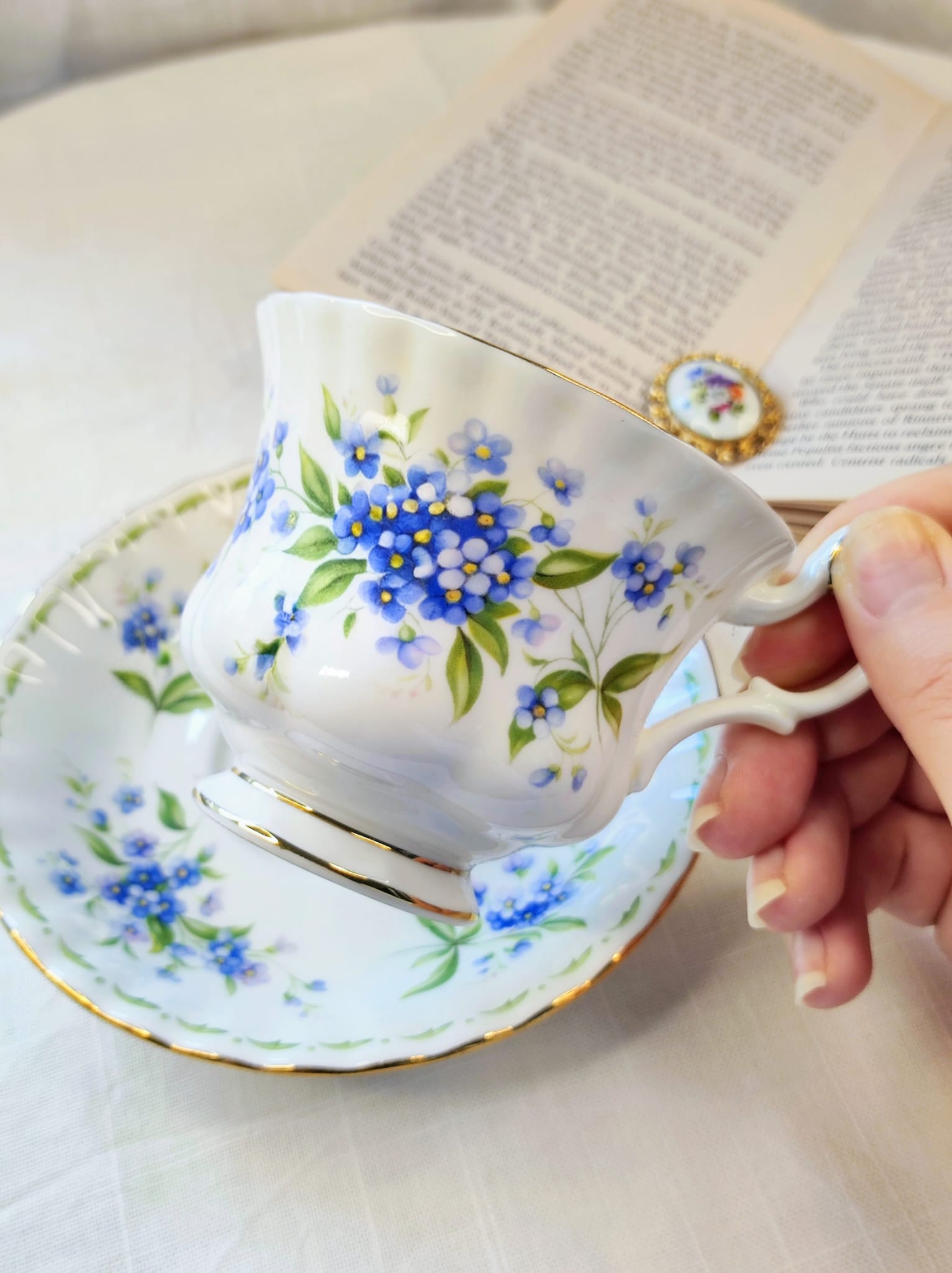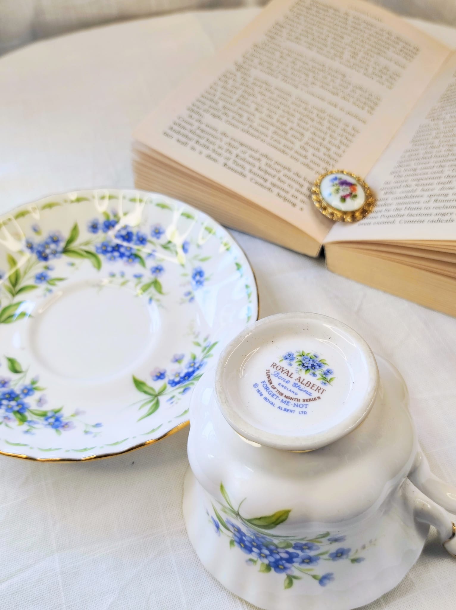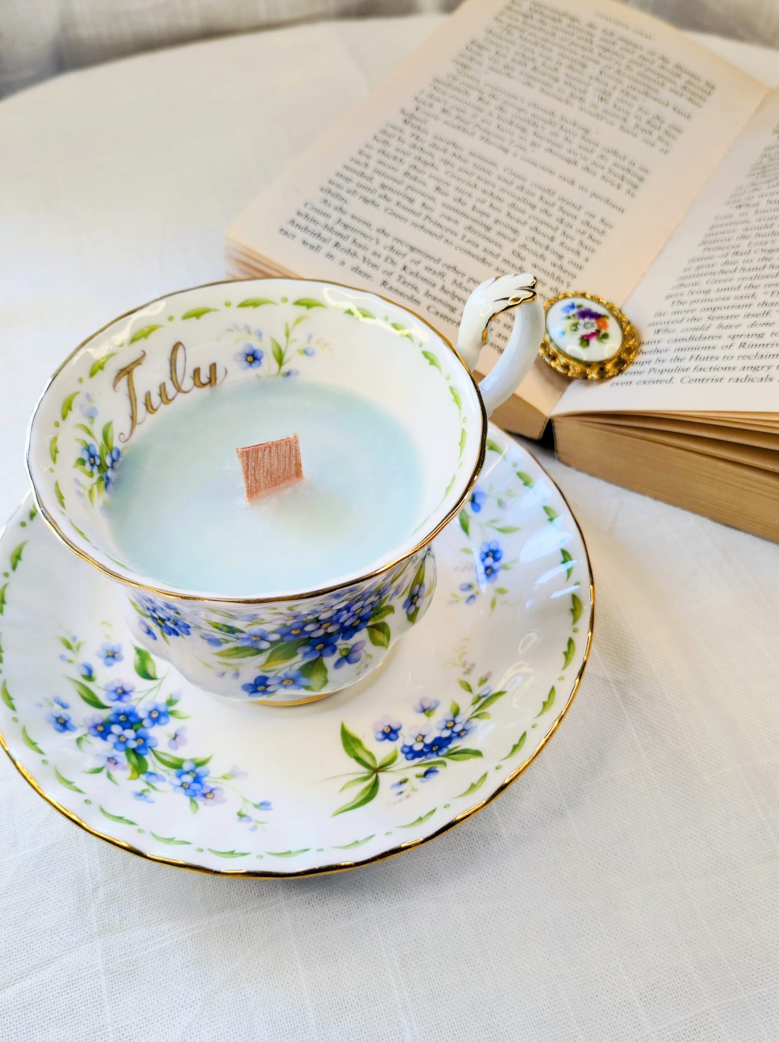 Bougie vintage coulée dans une tasse ancienne en porcelaine anglaise ROYAL ALBERT, parfum muffin aux myrtilles, pour recréer une ambiance douce et romantique inspirée de l’univers Bridgerton.