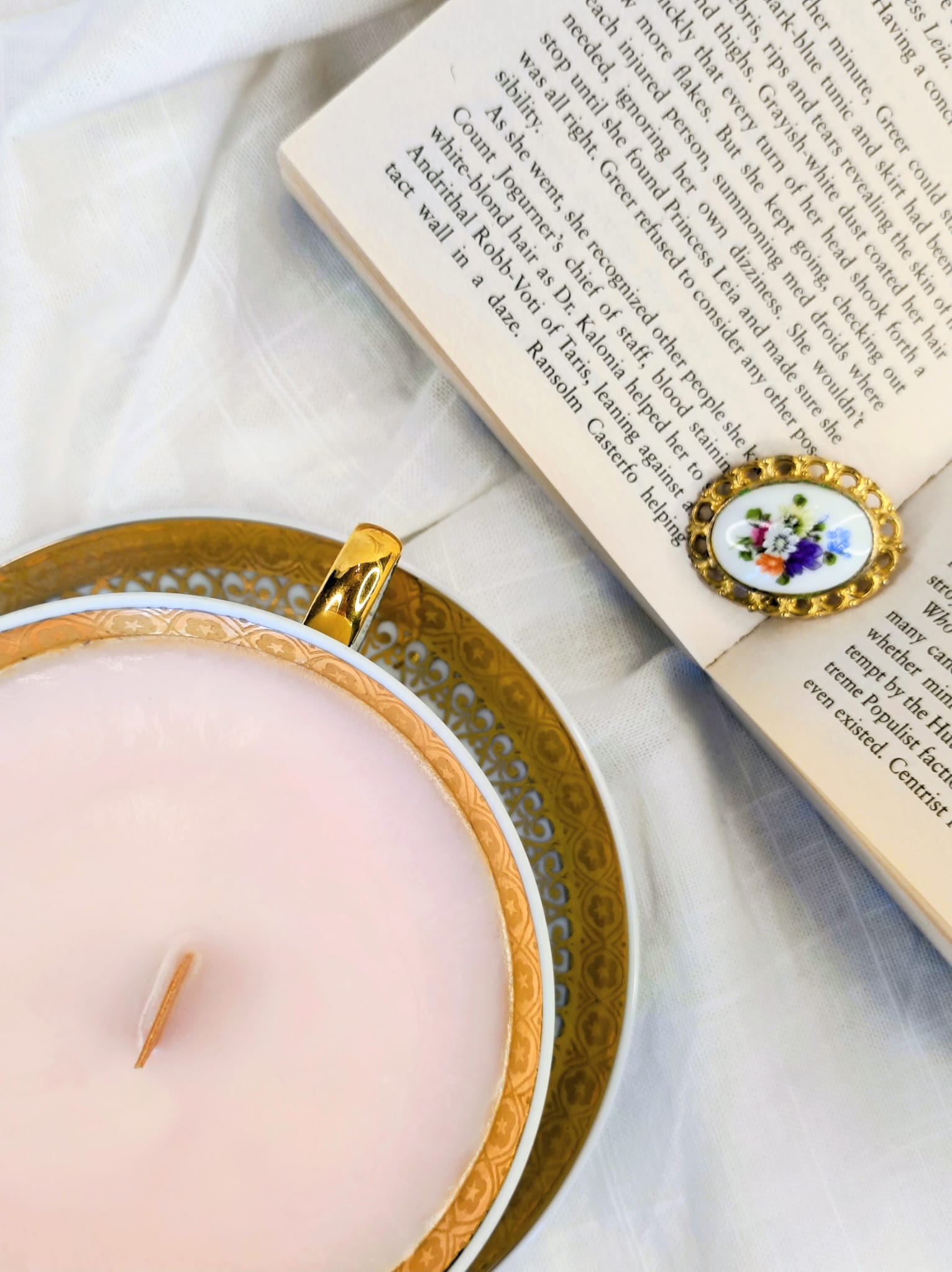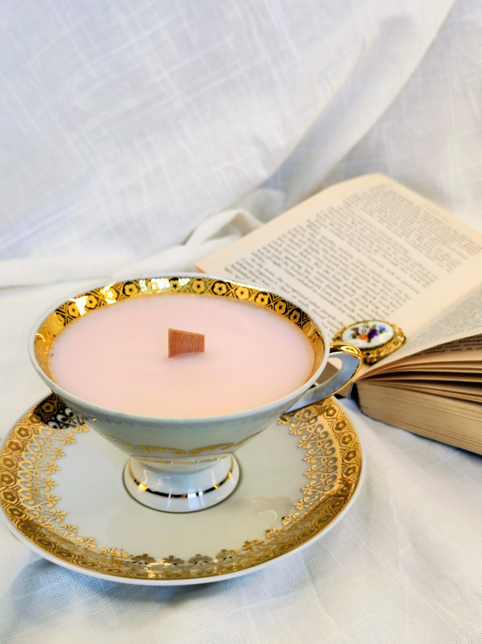 Bougie vintage coulée dans une tasse ancienne, parfum rose et jasmin, pour recréer une ambiance douce et romantique inspirée de l’univers Bridgerton.