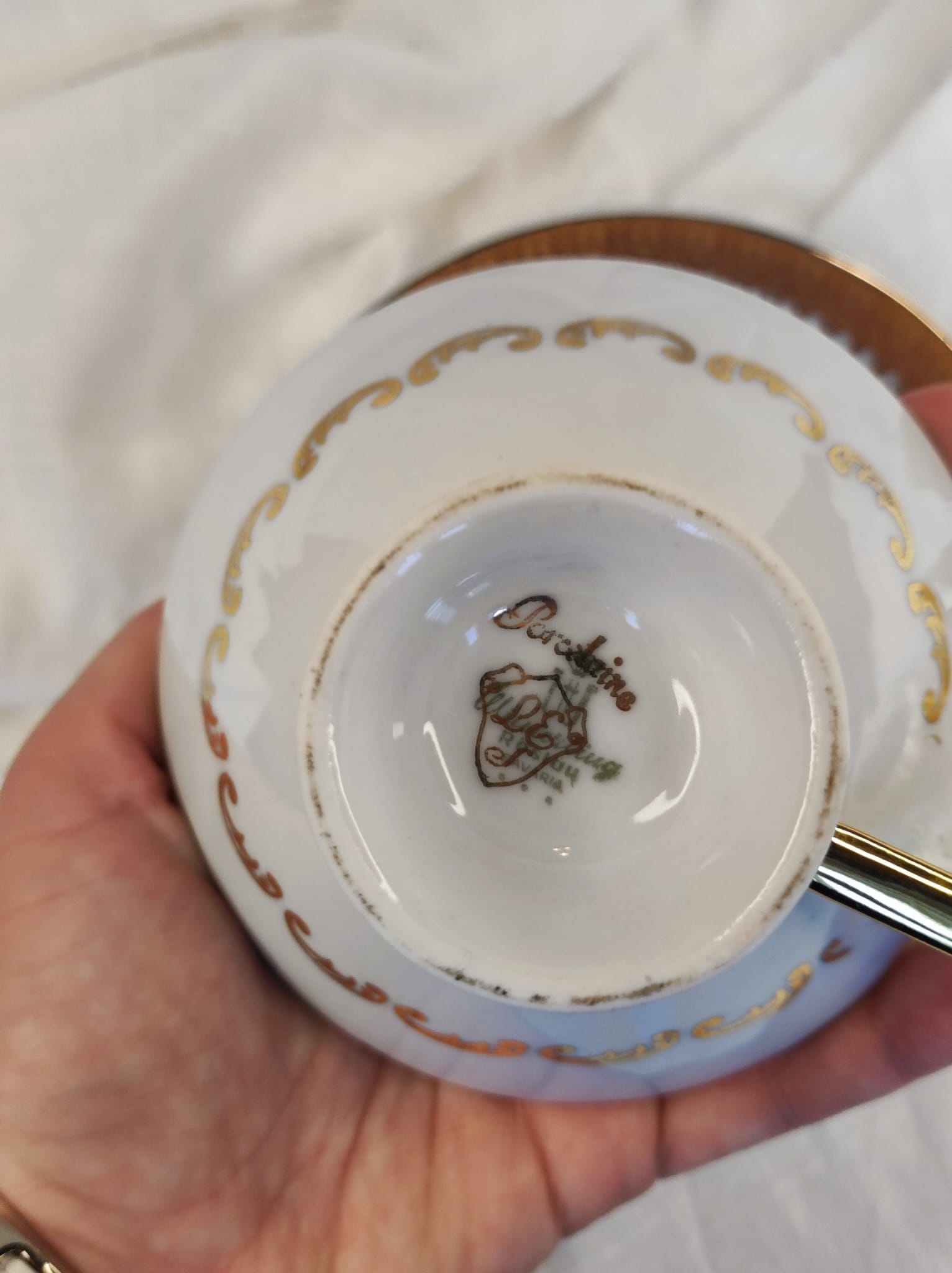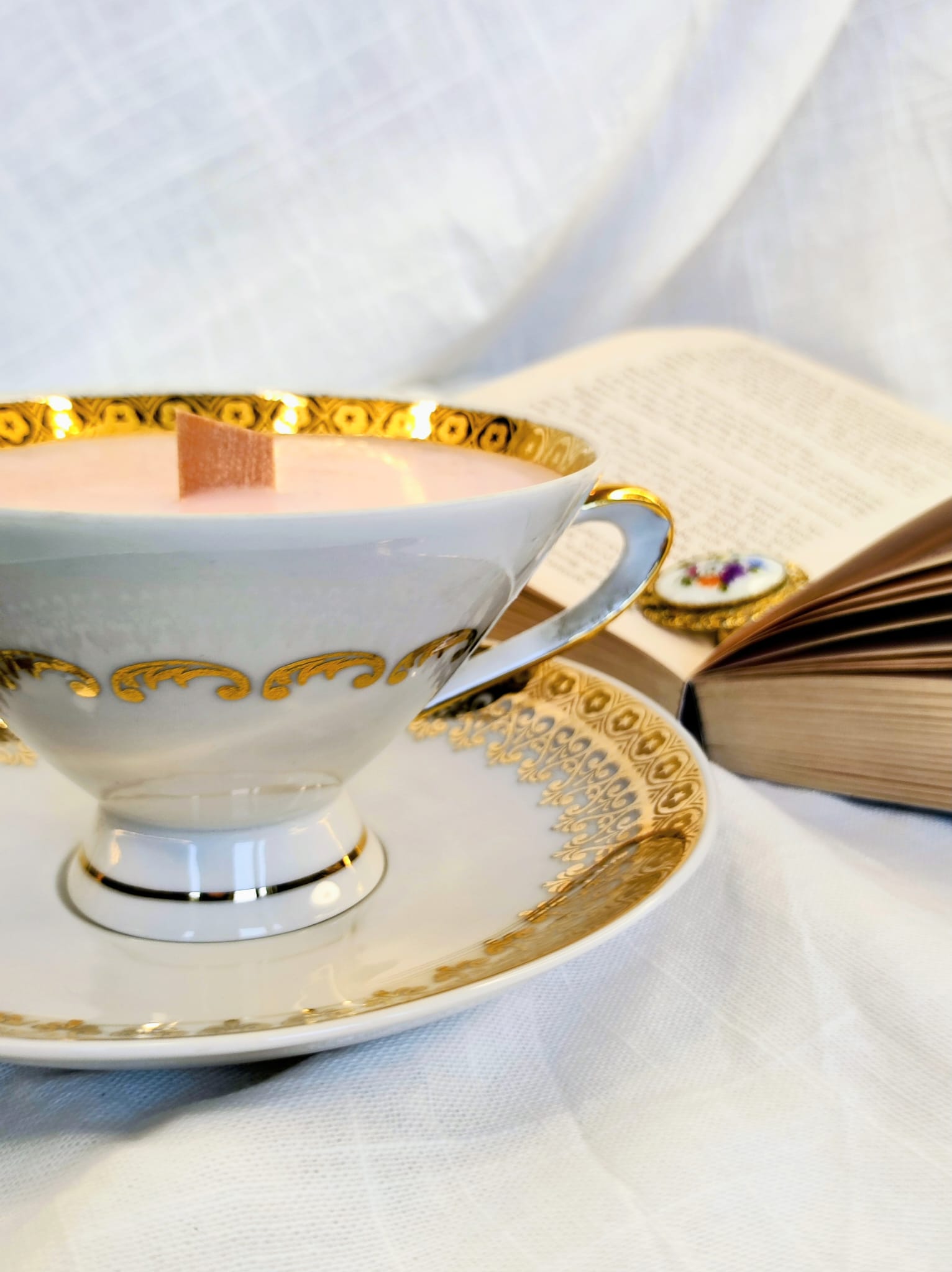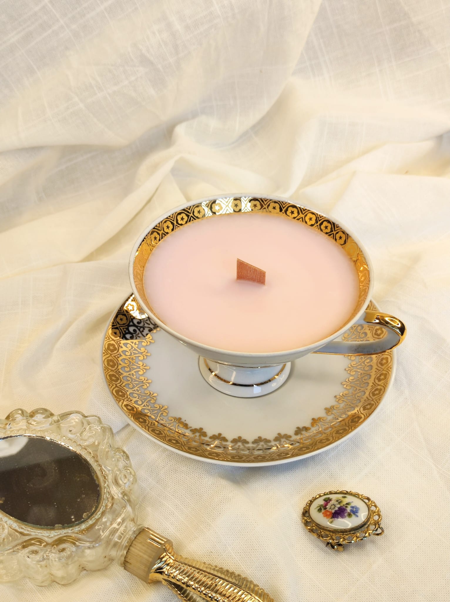 Bougie vintage dans tasse ancienne – inspiration Bridgerton