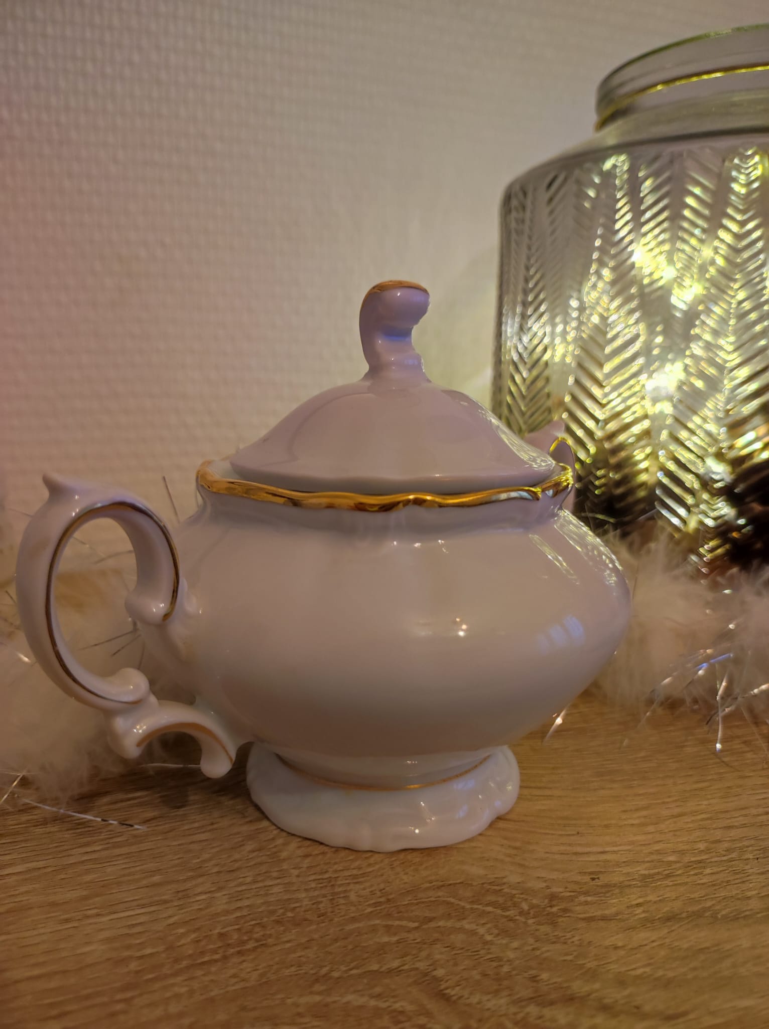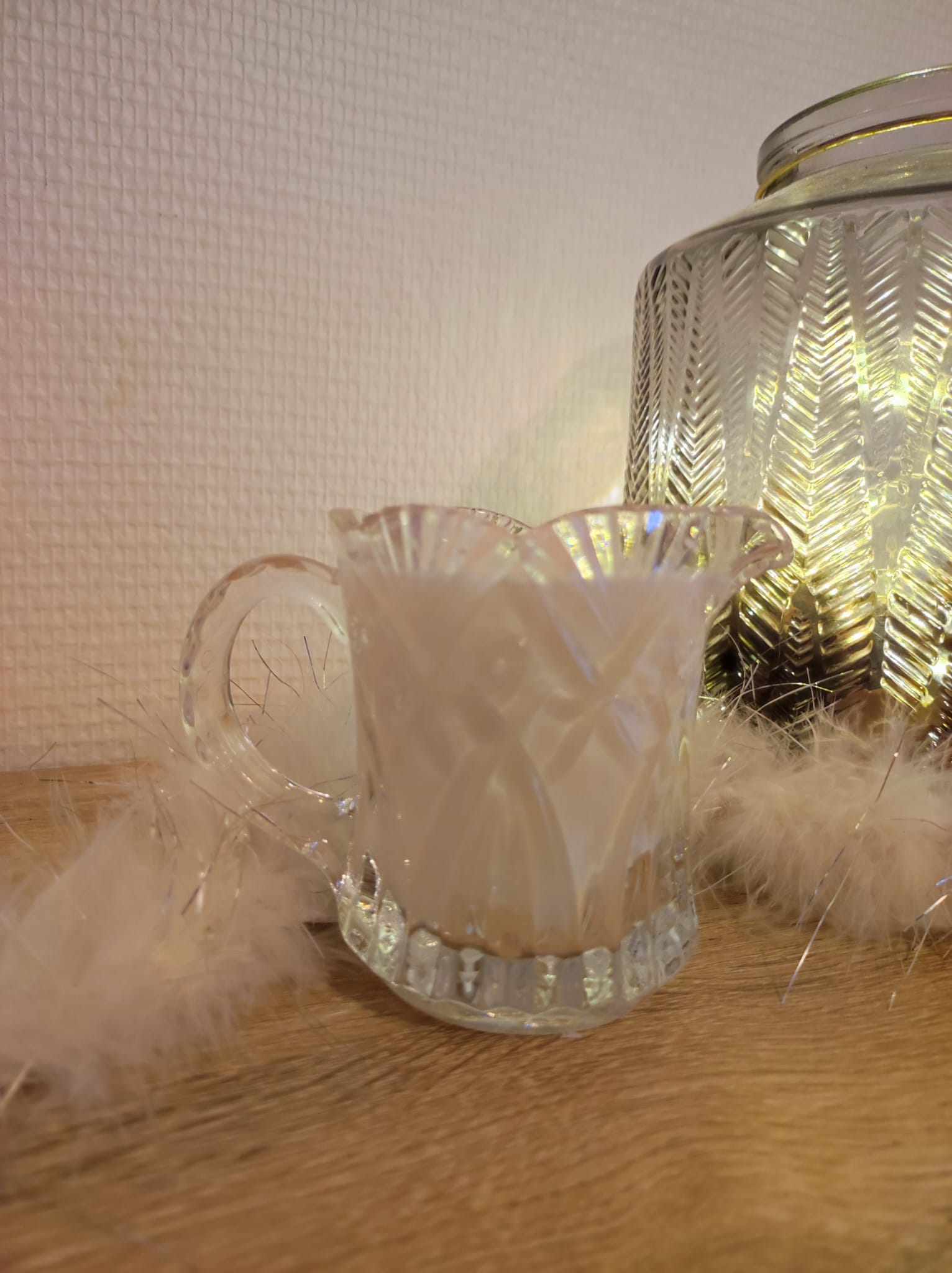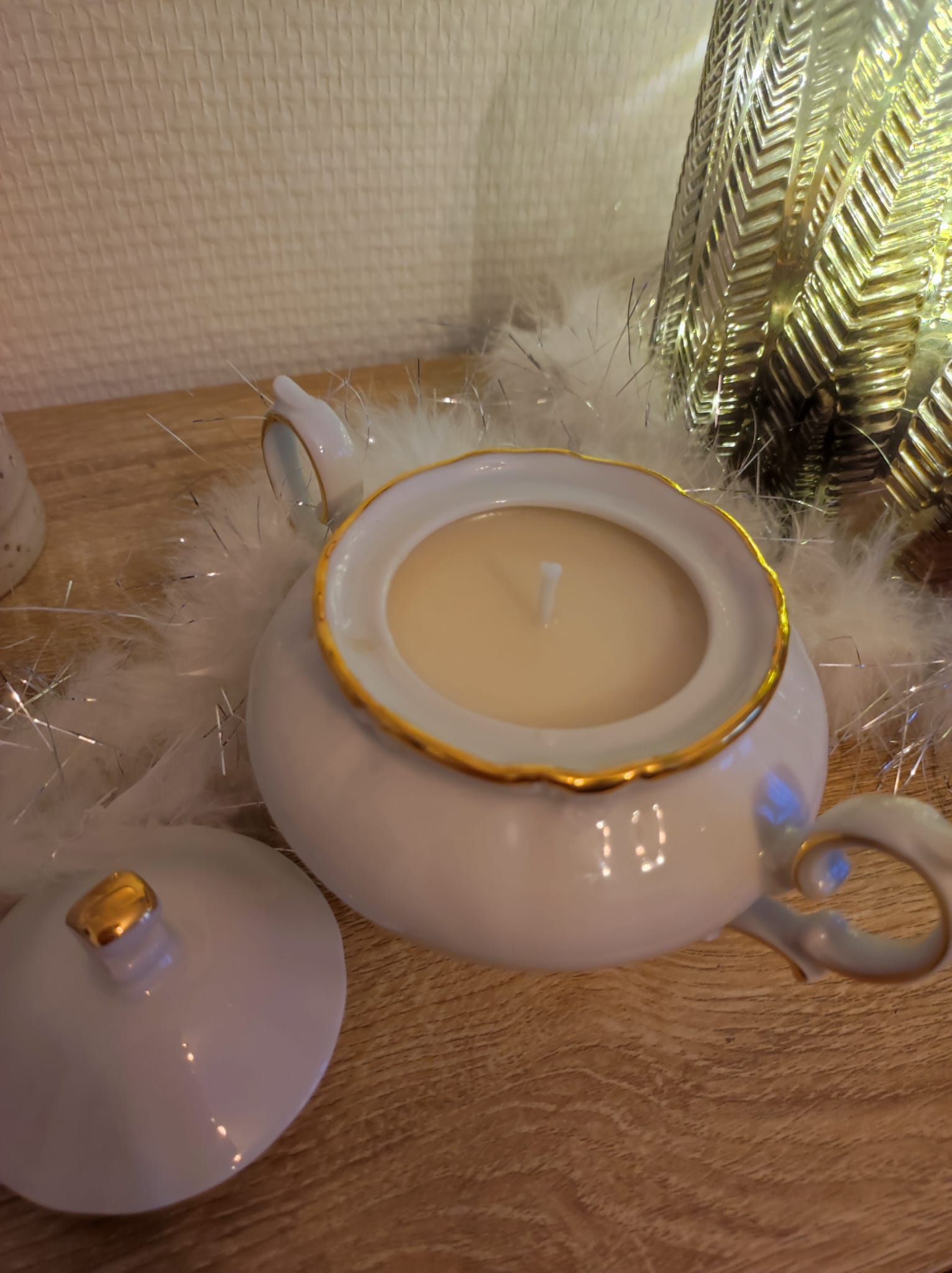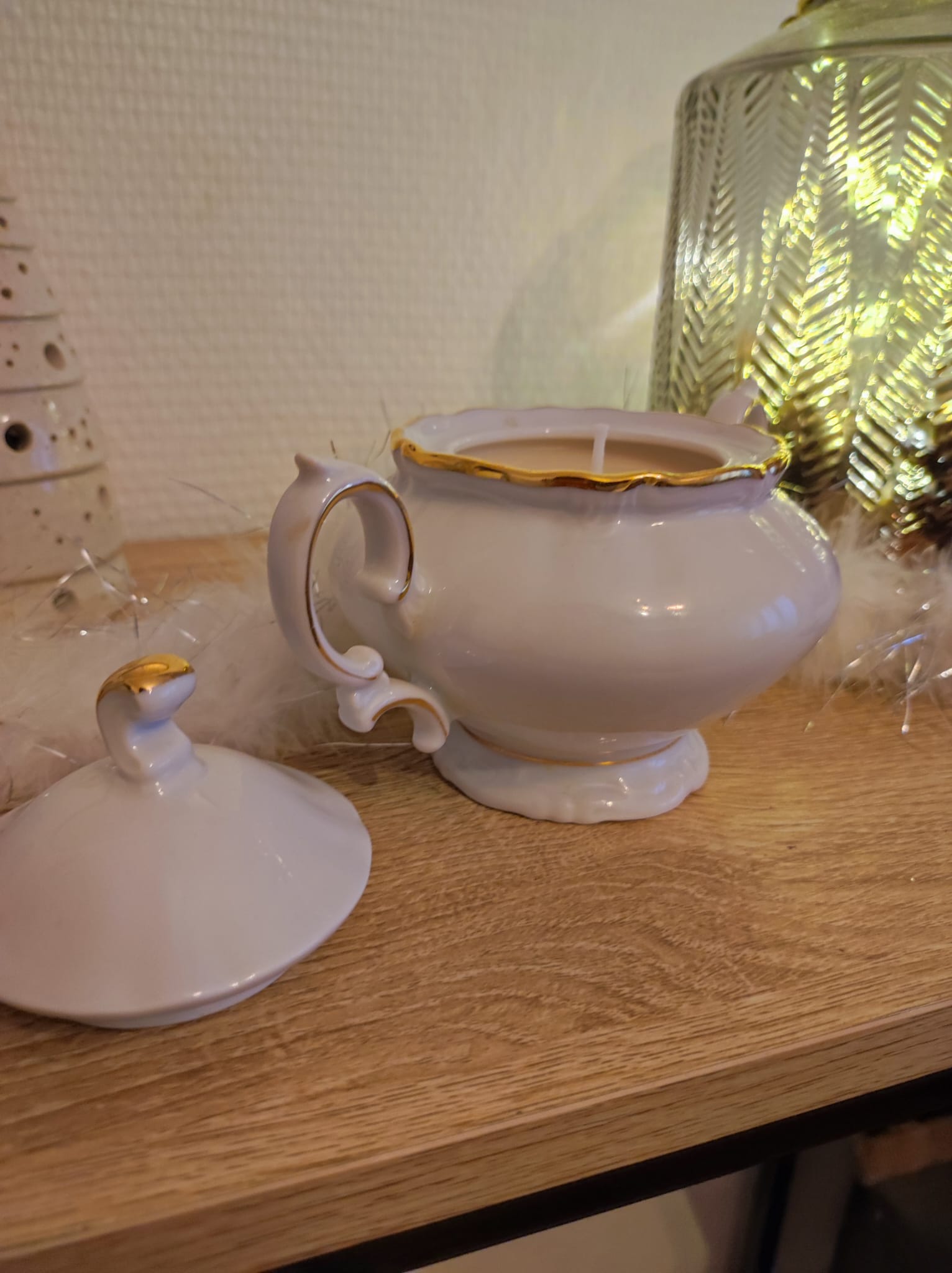 Cette bougie parfumée est présentée dans un sucrier en porcelaine upcyclé, offrant une seconde vie à un objet du quotidien.