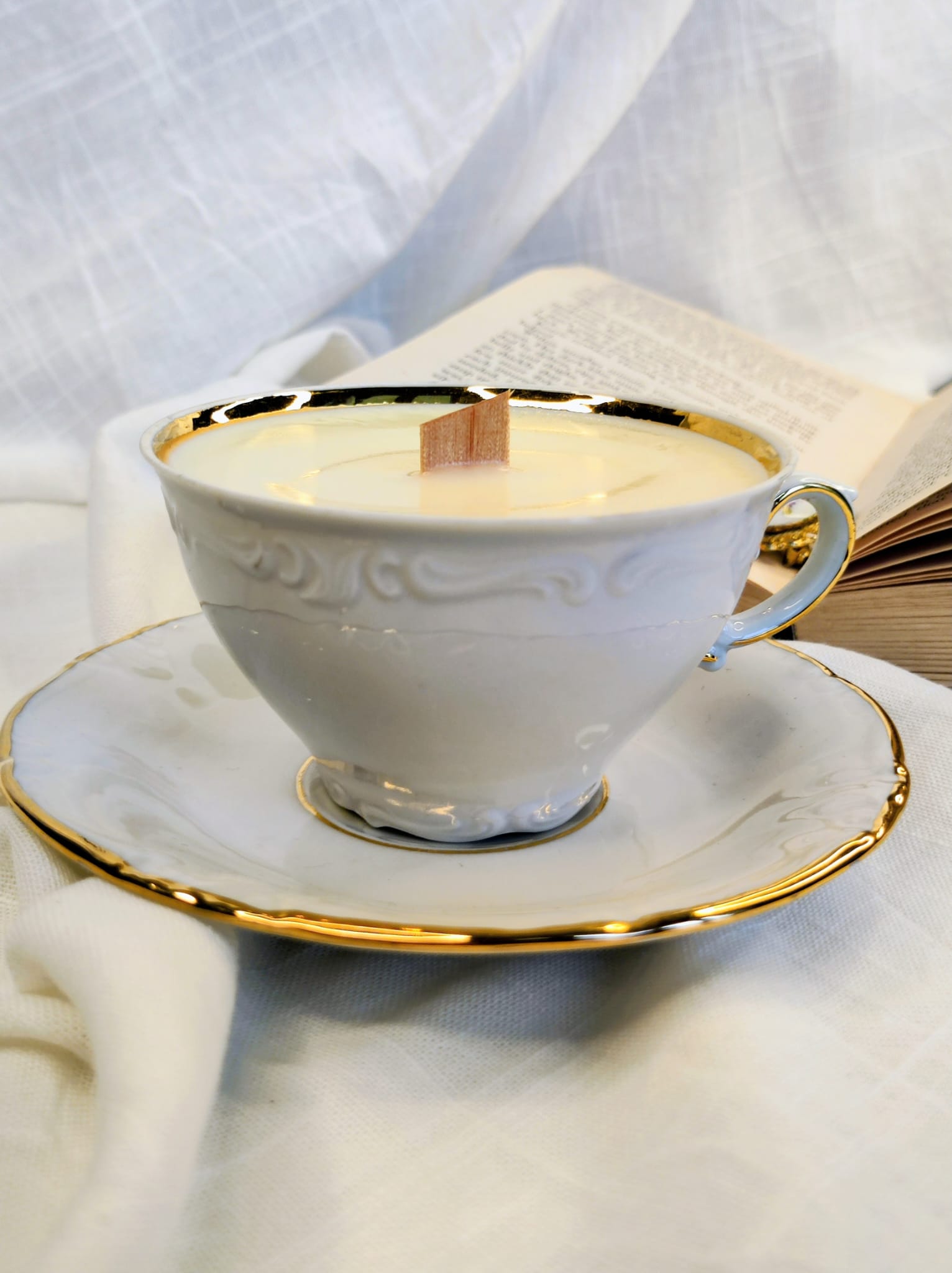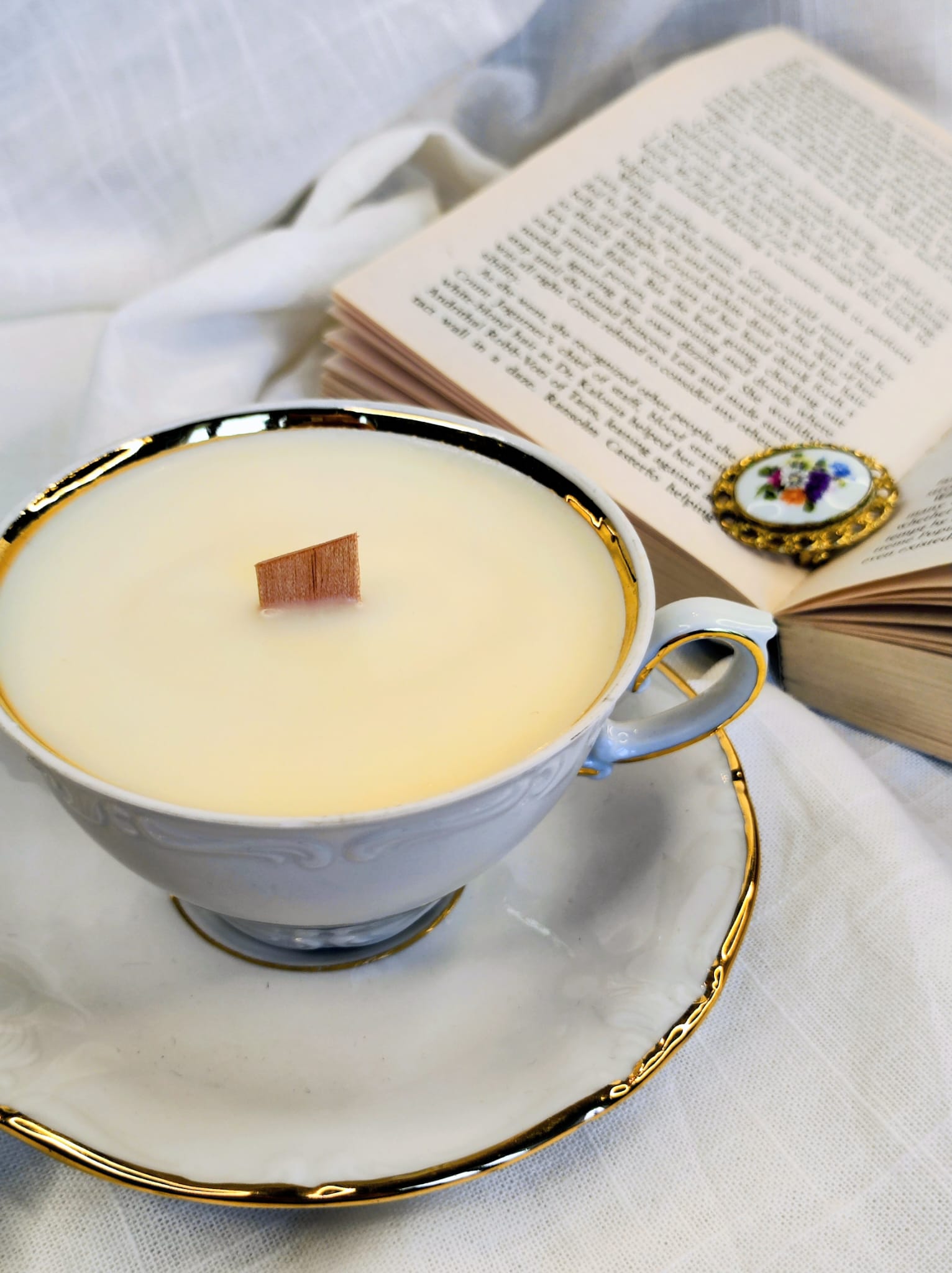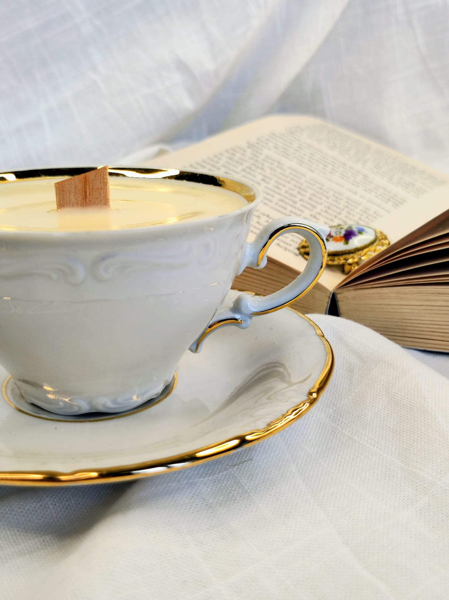 Bougie vintage dans tasse ancienne – inspiration Bridgerton